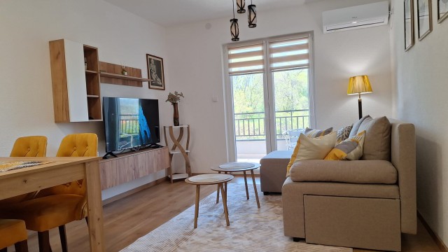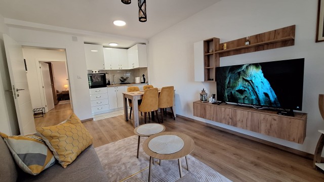 Gostima su na raspolaganju potpuno opremljena kuhinja sa šporetom, rernom i tosterom, kao i veš mašina za duži i komforniji boravak. Enterijer je moderan, nov i pažljivo uređen kako bi pružio maksimalnu udobnost tokom odmora.